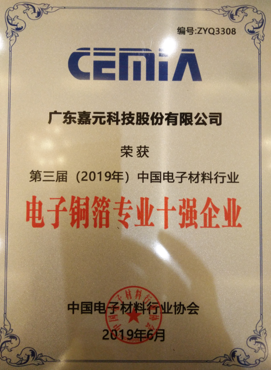 近日,best365英国体育在线(以下简称“公司”)收到中国电子材料行业协会颁发的“第三届(2019年)中国电子材料行业五十强企业”和“第三届(2019年)中国电子材料行业电子铜箔专业十强企业”荣誉称号。