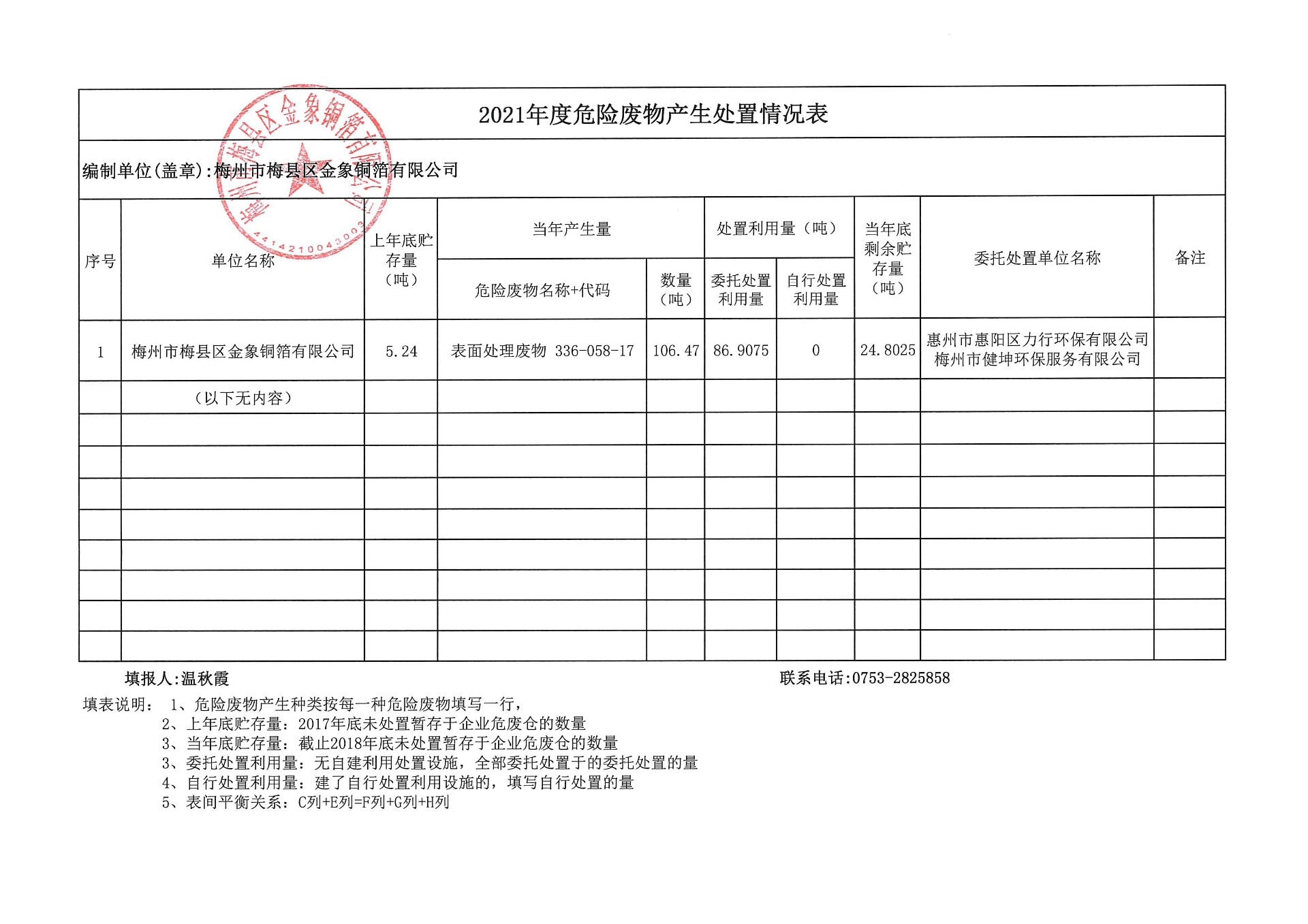 梅州市梅县区金象铜箔有限公司系best365英国体育在线的全资子公司,现将梅州市梅县区金象铜箔有限公司国家排污许可证中固废污染防治信息进行公示。