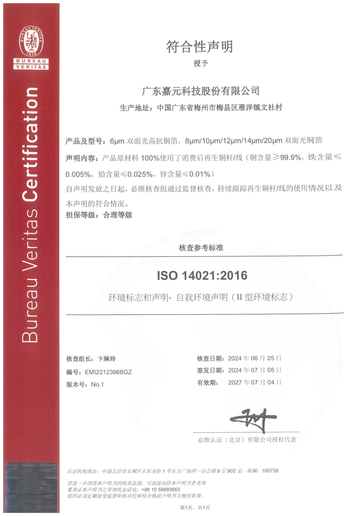 公司经营管理层高度重视再生材料体系建设工作,于2024年春节后召开了再生材料体系实施项目的可行性论证会议,科学研讨了企业实施再生材料体系建设的相关事项和工作计划,并提出“关爱地球,减少资源浪费;和谐发展,使用再生材料;合规经营,满足客户要求”的体系方针。围绕体系建设目标,公司上下迅速动员行动,成立项目工作领导小组,给予人、财、物等全方面支持,有序开展ISO14021:2016标准培训,并结合正在执行的质量管理体系进行再生材料体系文件的优化、修改和完善,进一步健全了体系标准。同时,公司以雁洋基地作为生产场所,围绕体系建设要求对车间进行设备更新、节能改造升级。供应链中心积极做好各项准备工作,明确了消费后再生铜料供应商资质。各部门在工作领导小组的组织下,紧密沟通、配合,全力推动再生材料体系建设有条不紊进行。据了解,再生材料体系适用公司6μm双面光高抗铜箔,8μm、10μm、12μm、14μm和20μm双面光铜箔等产品,相关产品原材料100%使用消费后再生铜杆/线(铜含量≥99.9%,铁含量≤0.005%,铅含量≤0.025%,锌含量≤0.01%)。目前体系所有流程在公司内部试运行达3个月以上,运行效果良好,制程能力、产品质量达到预期效果。经必维认证(北京)有限公司核查,于2024年7月5日取得《ISO14021:2016 环境标志和声明-自我环境声明(II型环境标志)》证书。未来,best365英国体育在线将持续提升绿色竞争力,在绿色发展的道路上行稳致远,为新能源事业作出新的贡献。