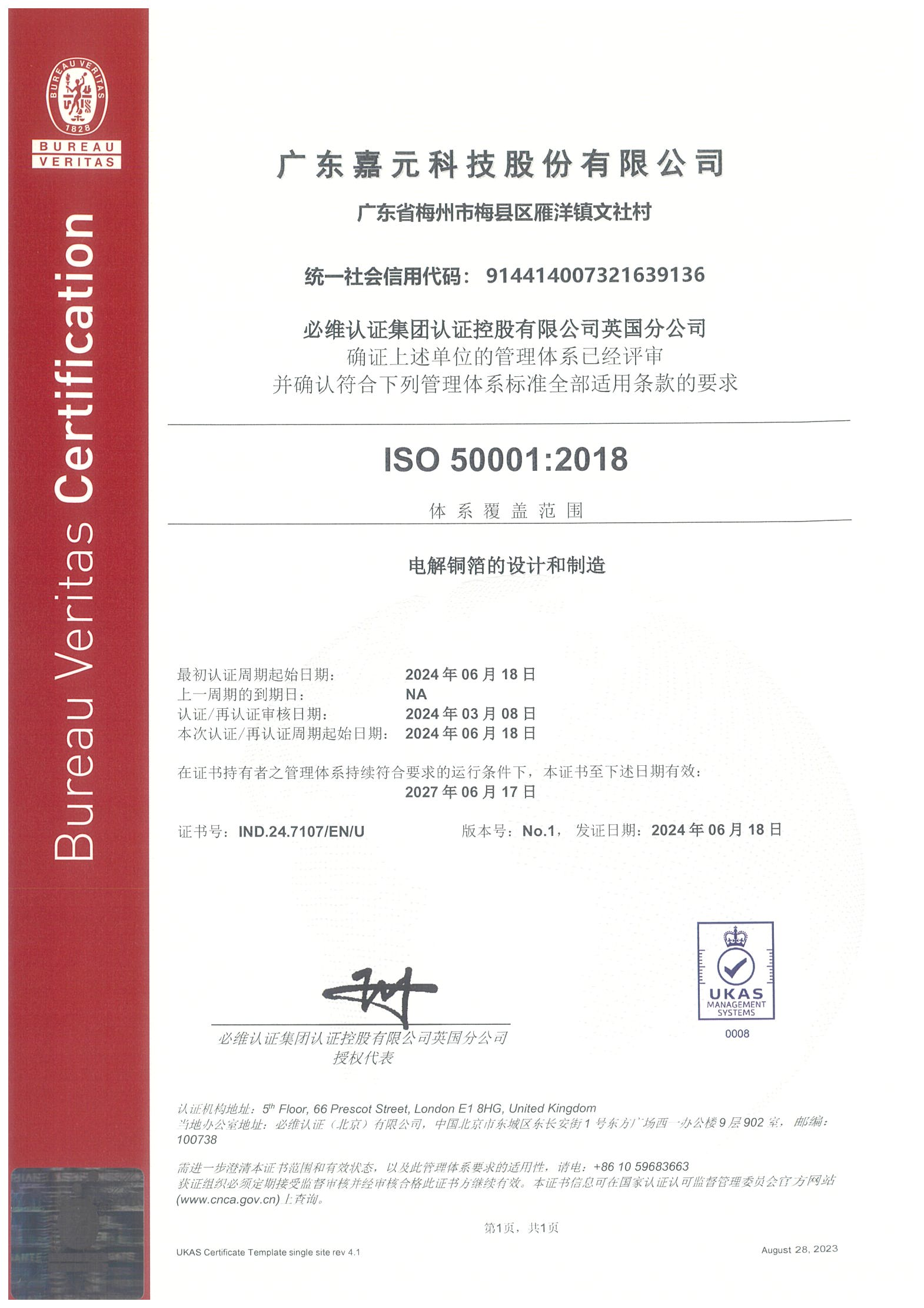ISO 50001:2018能源管理体系证书